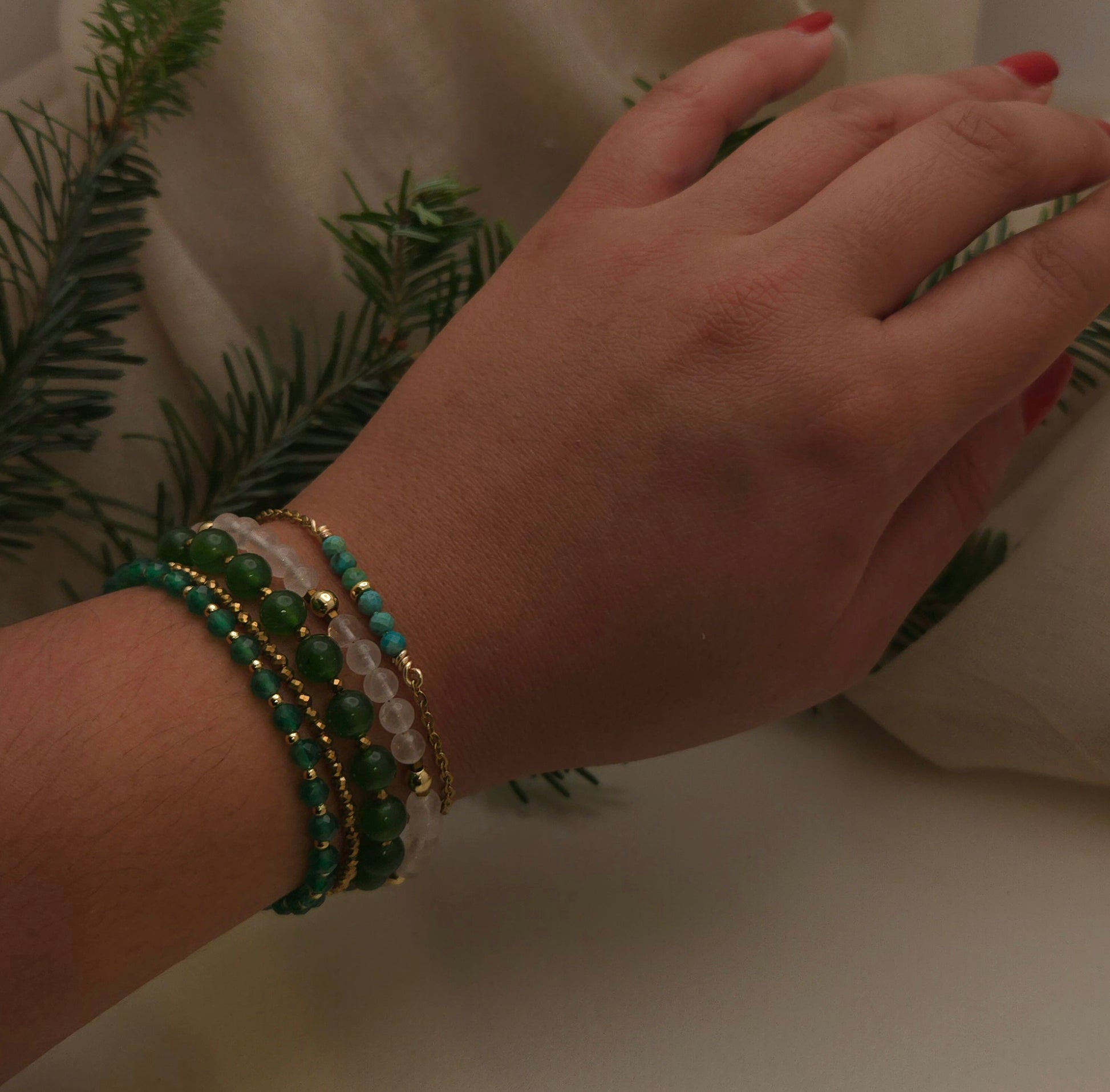 Each piece is handcrafted with natural gemstones and metals that carry their own subtle variations in color, shape, and tone. The piece that finds you is entirely your own — a reflection of nature’s artistry and your individuality.