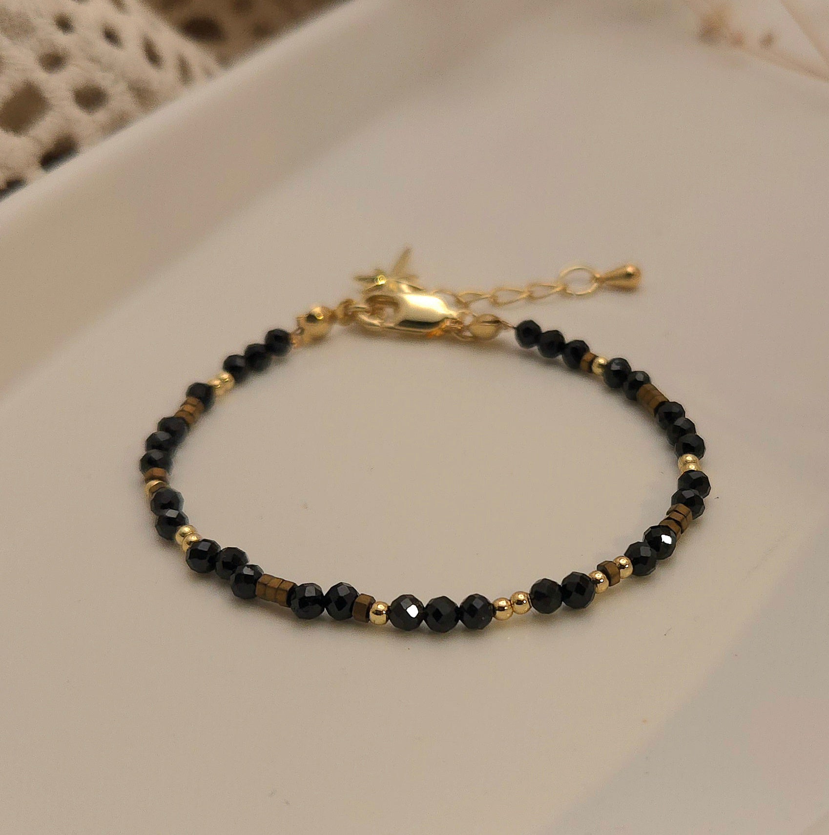 The Mariah Bracelet is a study in quiet intensity — faceted black spinel beads paired with warm gold accents create a rhythm of shadow and light. Designed for those drawn to depth and subtle drama, she brings a sense of grounded elegance whether layered into a stack or worn alone.  The delicate charm accent make her feel personal, intentional, and effortlessly refined.