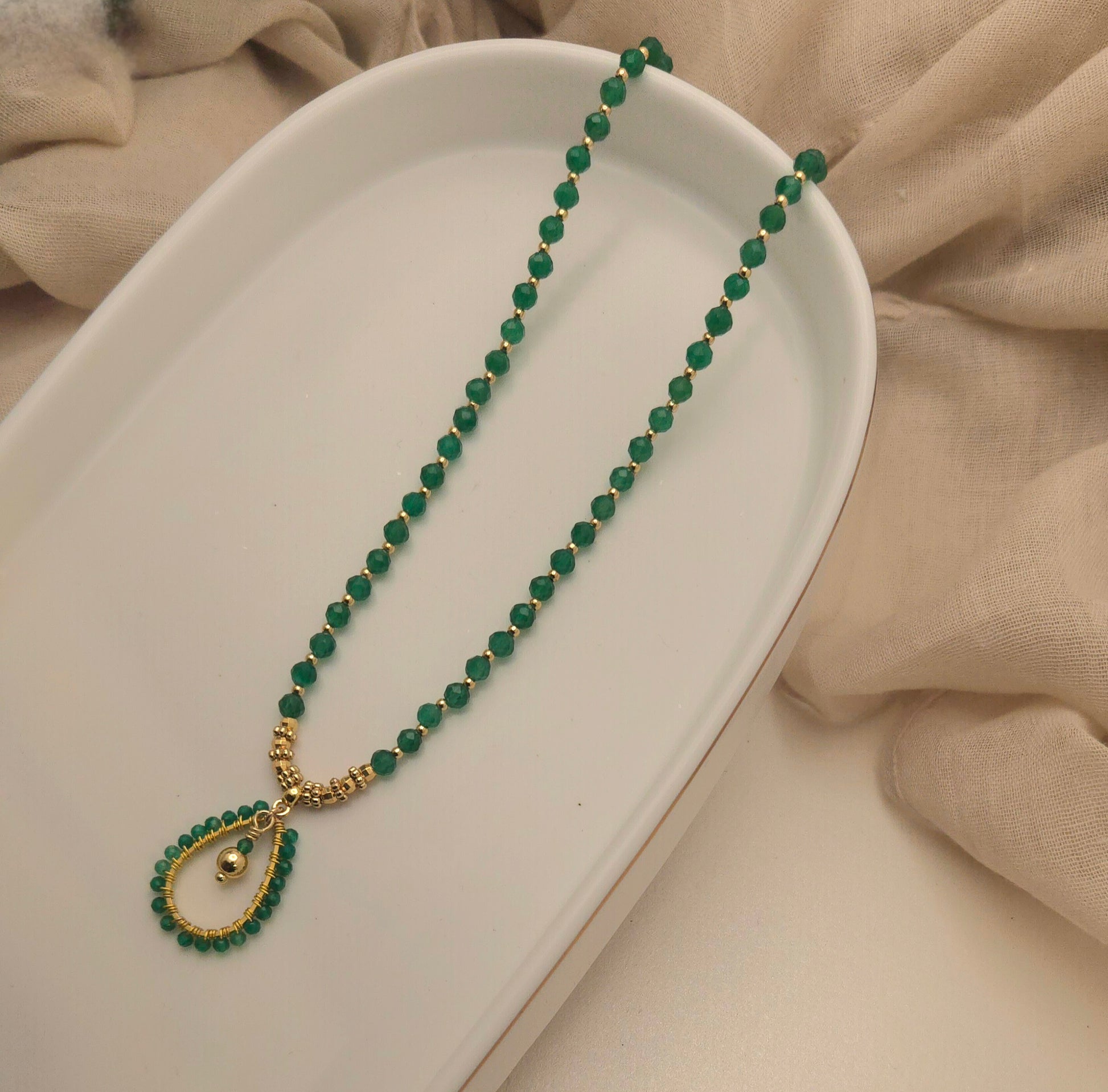 Hand-strung with luminous Freshwater &  Shell Pearls and gleaming gold accents and Green Agate beads, the Thalassa necklace embodies the grace of the sea & earth goddess with a pear-shaped pendant and delicate drop for timeless, feminine sophistication.
